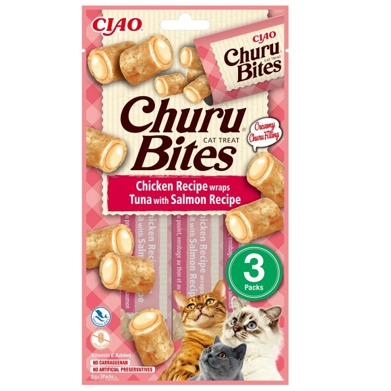 Hrană suplimentară pentru pisici. Churu Bites Ton și Somon - Bucățelele Churu Bites în formă de pernuță sunt caracterizate prin pui prăjit fraged la exterior și umplutură cremoasă Churu în interior. Două texturi diferite într-o singură pernuță.